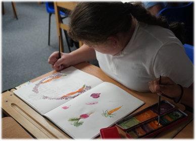 Giuseppe In art, the children researched the life of the famous artist Giuseppe Arcimboldo, who created portrait heads from everyday materials such as fruits, vegetables, flowers, fish, and books. The children built up their skills, including sketching and using watercolours to create their very own Giuseppe-inspired portraits. |